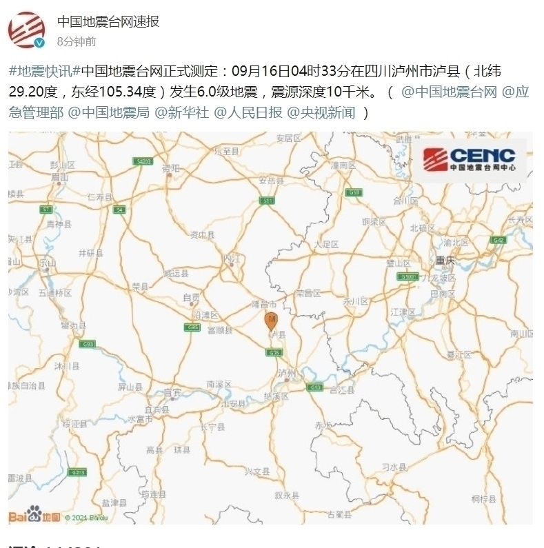 9月16日4点33分,泸县发生6.0级地震。目前,泸州市已启动一级应急响应。