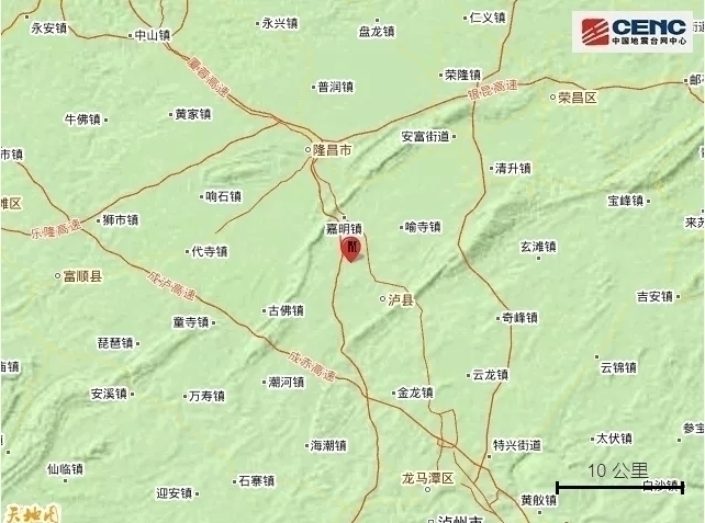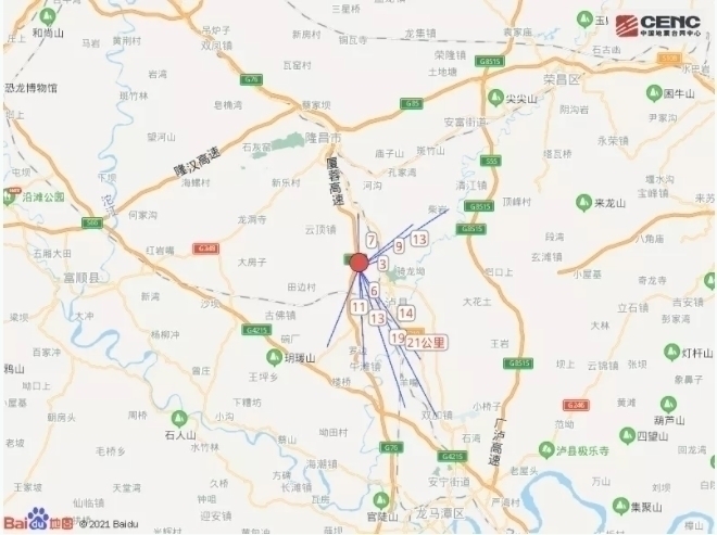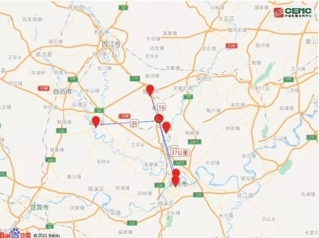 周边县城:震中距泸县7公里、距隆昌市16公里、距龙马潭区33公里、距富顺县36公里、距江阳区37公里,距重庆荣昌区36公里,距重庆市124公里。